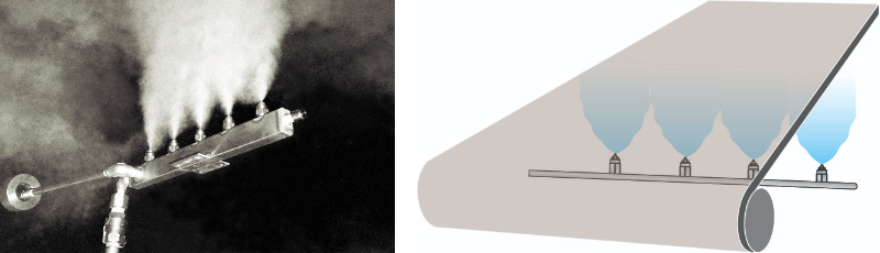 Các béc phun chất lỏng chuyên dụng hiện nay sử dụng công nghệ phun sương mịn, phân bố đều lượng dung dịch chống nấm mốc trên bề mặt vật liệu. Các hệ béc phun được thiết kế để tạo ra: