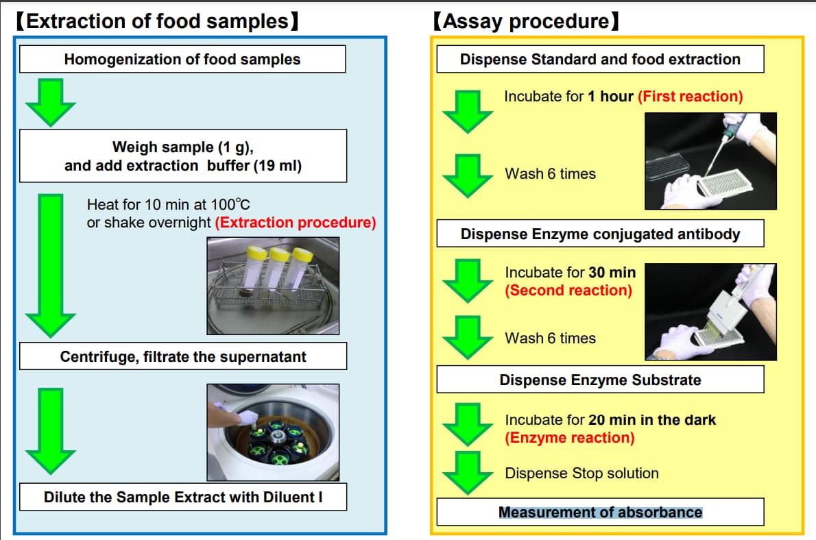Morinaga sử dụng phương pháp Sandwich ELISA: mẫu được chiết xuất, sau đó kháng nguyên (ví dụ protein dị ứng) sẽ được bắt giữ bởi kháng thể cố định trong giếng. Sau các bước rửa, kháng thể thứ hai liên kết enzyme được thêm vào và tạo phản ứng màu khi có thêm cơ chất, và kết quả được đo bằng máy đọc tại bước sóng 450 nm.